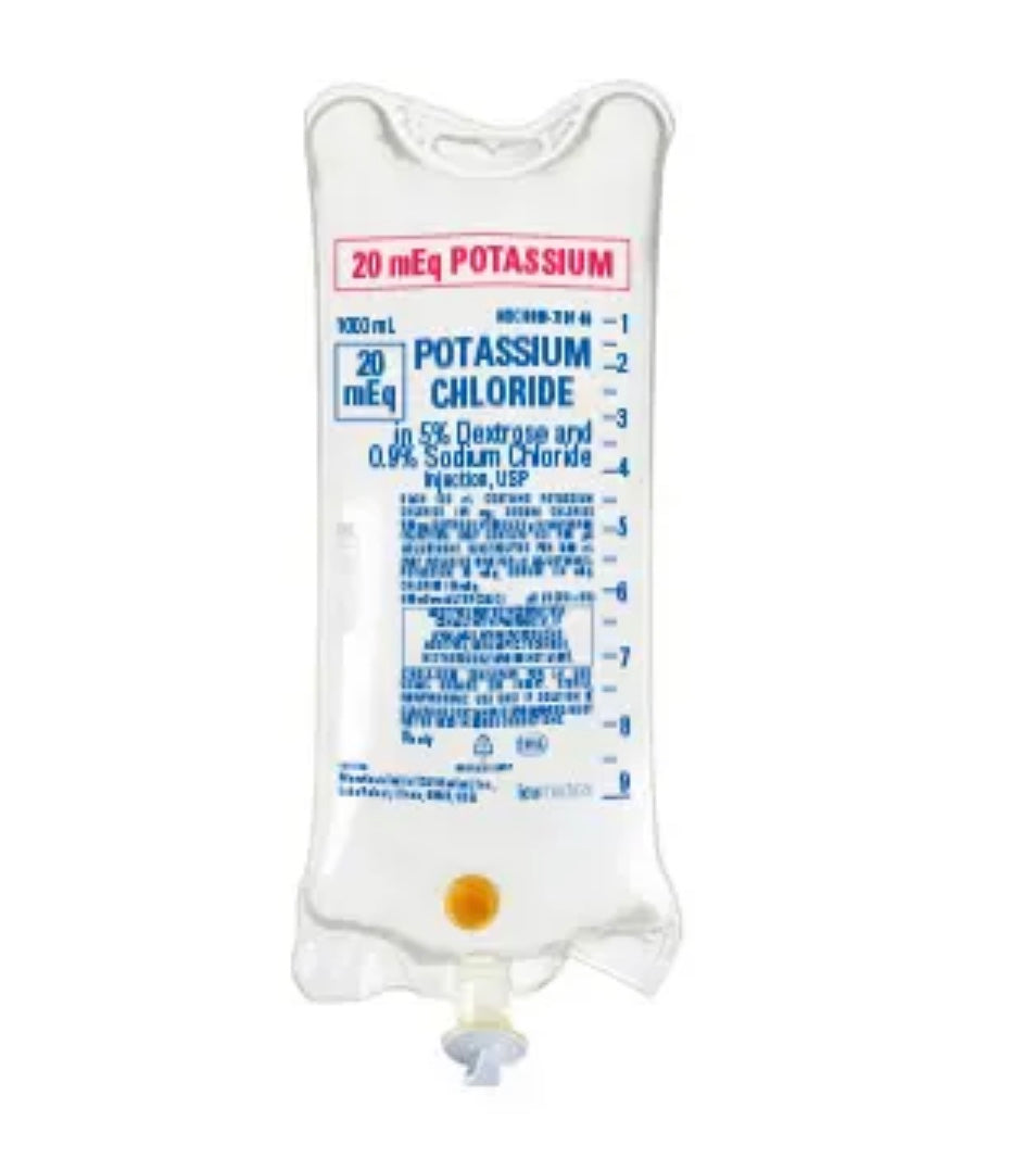 | Concentration | 20 mEq (KCL) / 5% (Dex) / 0.9% (NaCl) |
